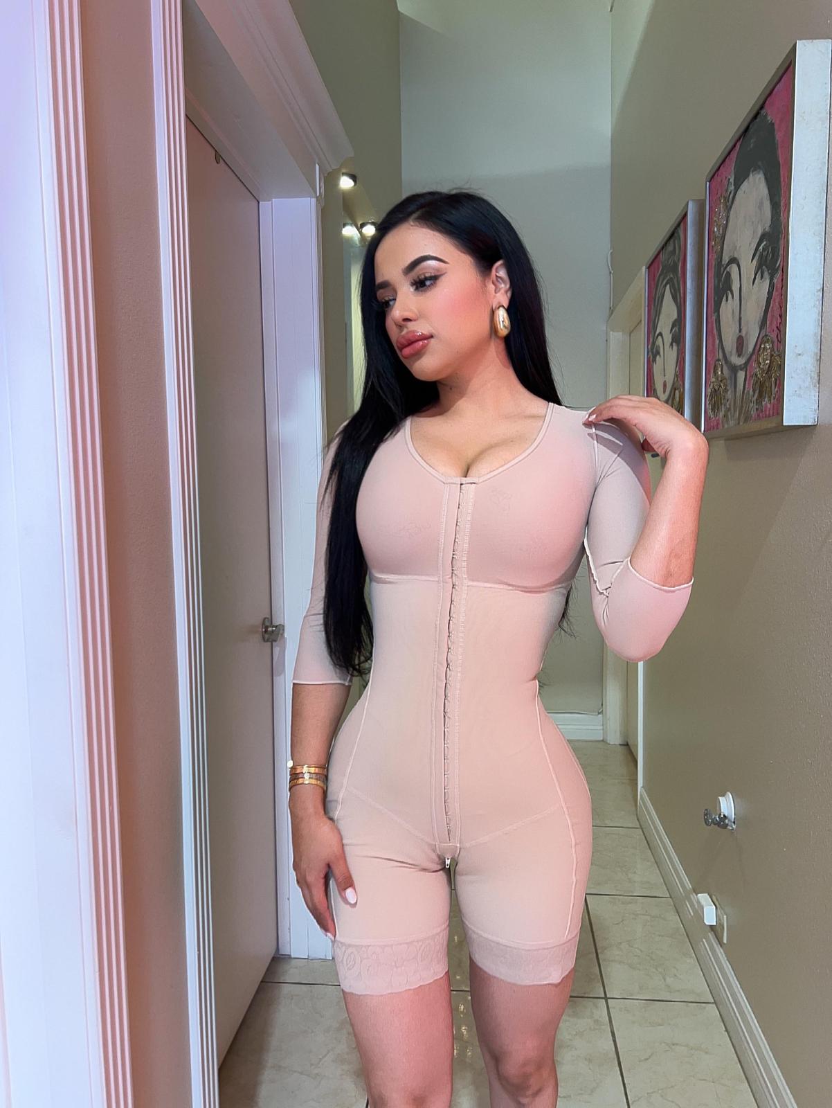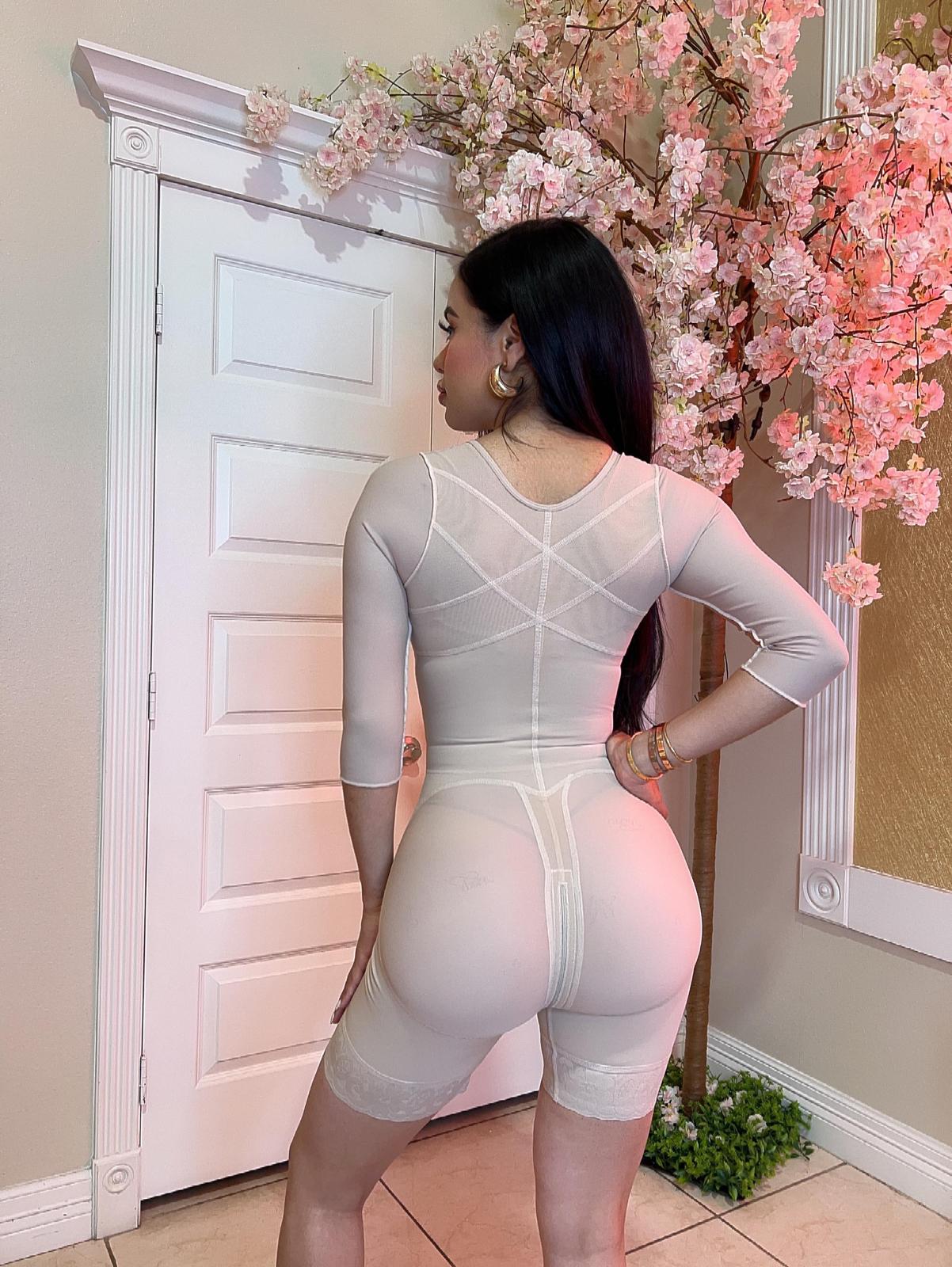 Two hooks line, zipper in the perineal area & 3/4 sleeves.